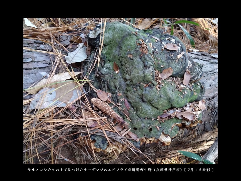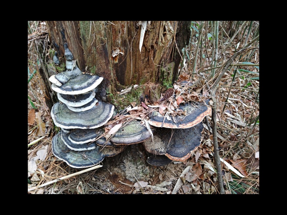 ◎例4 朽ちた切株の側面にできたサルノコシカケの上