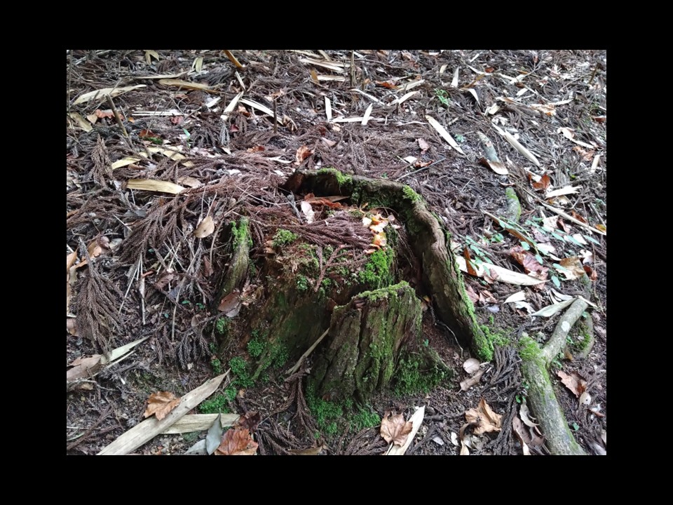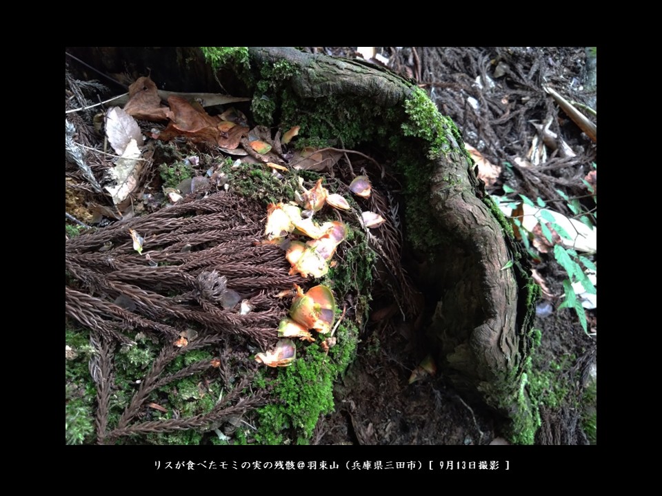 さて、昨年の9月、羽束山の山頂にある切株の上に、齧り取られたモミの実の鱗片が纏まってあることに気づきました。鱗片の縁が緑色だったので、何者かが樹上にある未熟な実を取ってきてここで食べたのでしょう。