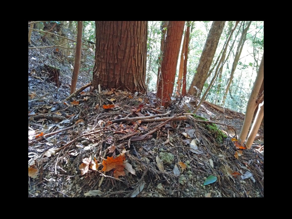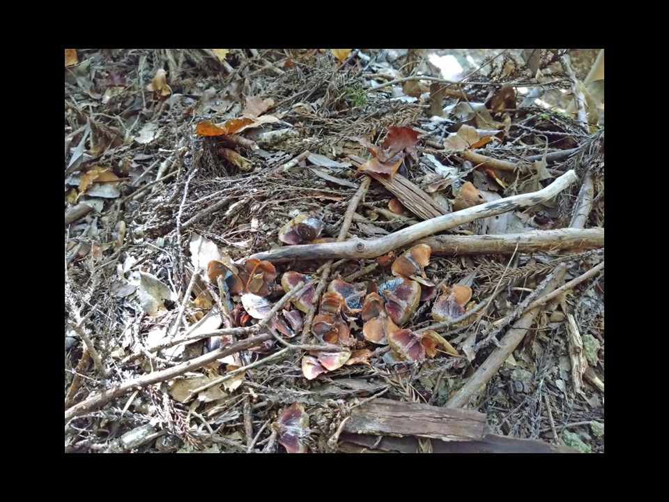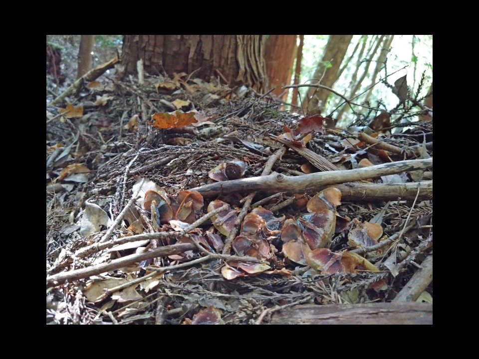 ということで、今回は一例として、杉の木の下でリスが創ったファーローズを紹介します。この場所から見て最寄りのモミの木は、画面中央よりやや右奥の個体(右側に傾斜した灰白色の木)になりますが、距離にして6〜7mぐらい離れています。たぶん、リスはその個体から取ってきた実をここまで運んできて食べたのでしょう。