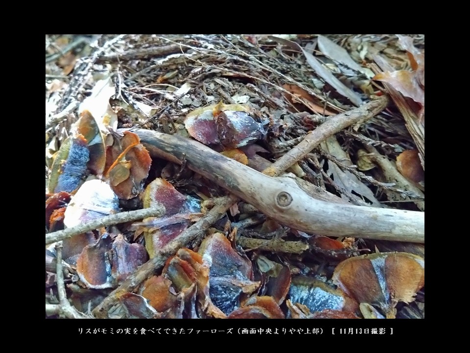 羽束山に生息する齧歯類はリスと野ネズミぐらいですから、わざわざモミの木の高所から大きな実を取ってきて地上で食べたのは、リスと考えて間違いありません。ただ、リスが食べたにしては、その残骸であるエビフライがどこにも見当たりませんでした。
