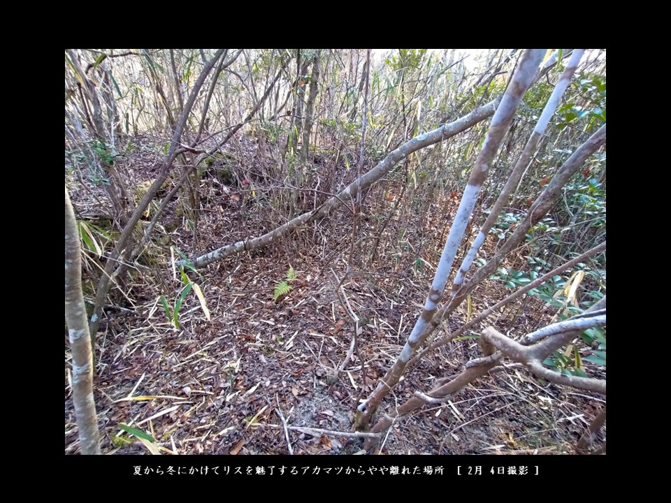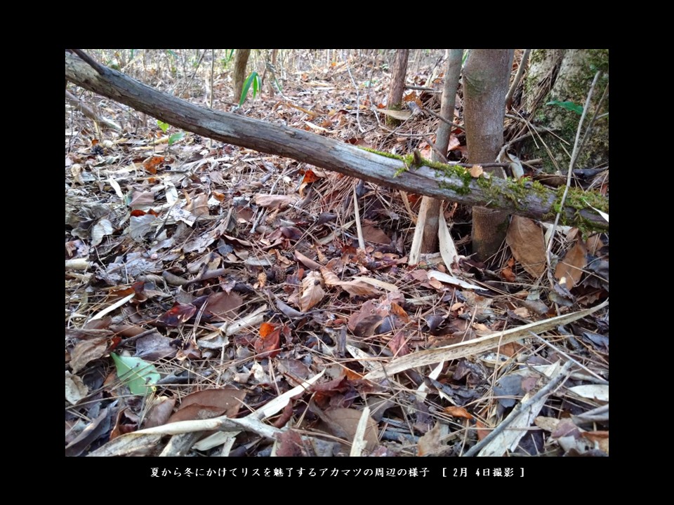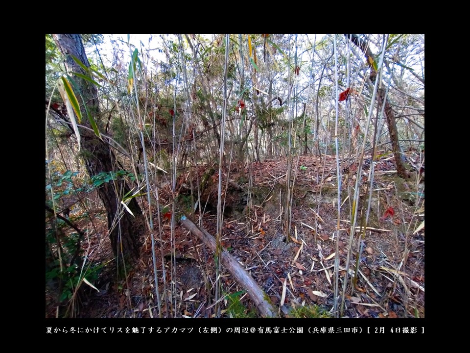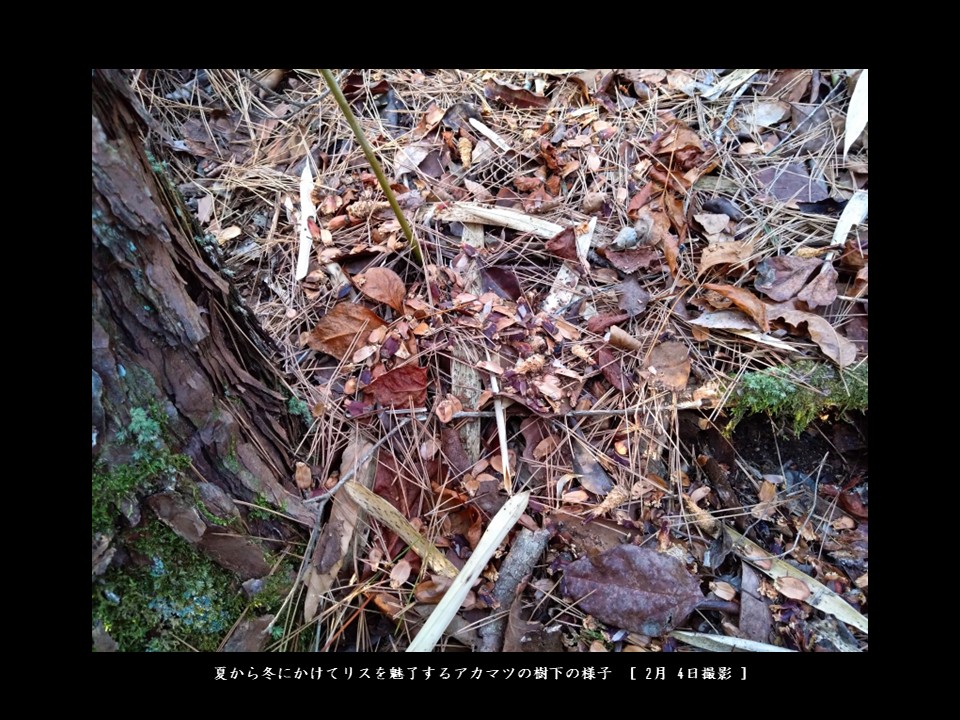 ただ、今のところリスを魅了する健全なアカマツの周辺には、これまで通りたくさんのエビフライが認められます。一例として、ほぼ一年を通してリスに人気のある有馬富士公園の個体 [ No.74で紹介 ] の周辺の様子を撮影したものを紹介します。