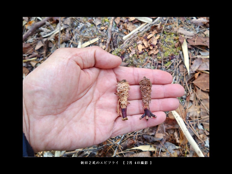 そこには、微かに緑の苔がある地面の上に、齧り取られた鱗片とマツボックリを食べて間もない新鮮なエビフライが1尾、そしてすっかり色褪せて少しばかり緑の苔が付着した古いエビフライが1尾ありました☆☆
