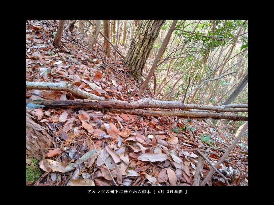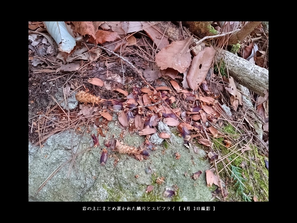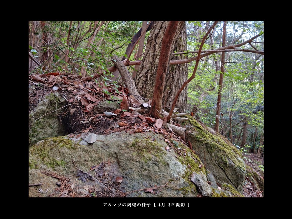 昨年はマツボックリが不作だったせいか、先月の上旬にこのアカマツの周辺を探索した時には、まったく食痕が認められませんでした。なので、今年はもうリスは来ないものだとばかり思っていたのですが、美しいツツジの花に誘われてやって来たリスが、ここでマツボックリを食べながら花見でもしたのでしょうか?